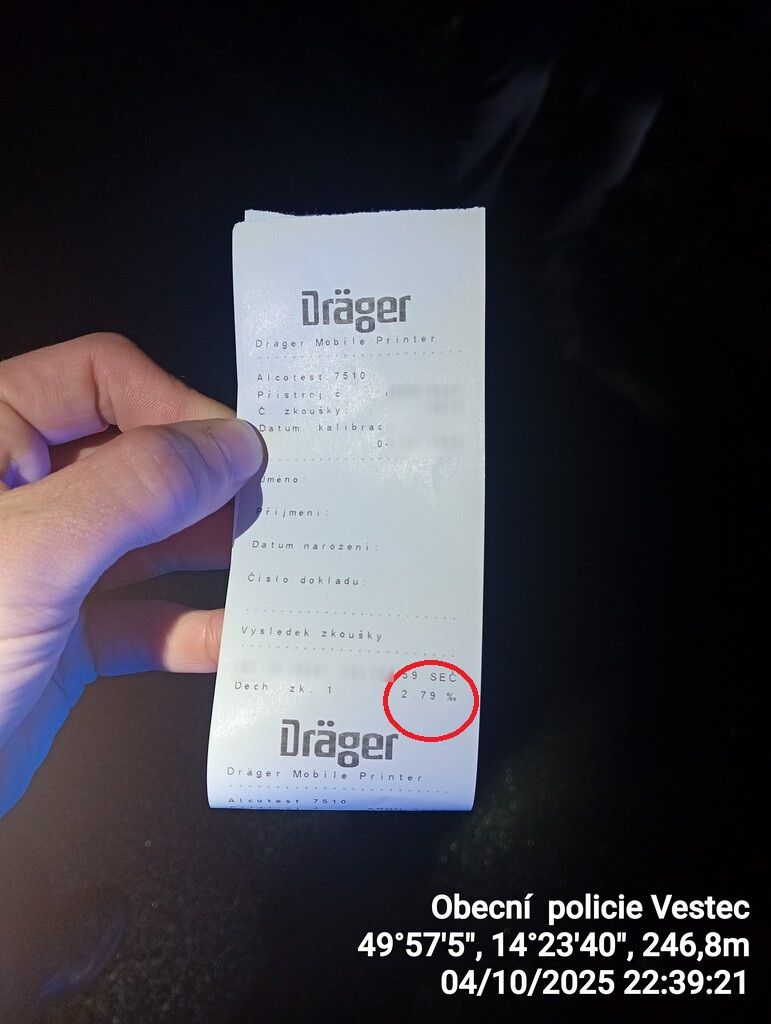 V sobotu 4. října 2025 byla hlídka Obecní policie Vestec při výkonu služby upozorněna na vozidlo, které jelo nebezpečným způsobem. Podle svědka mělo dojít k vytlačení protijedoucího vozidla až na chodník, přičemž byl řidič podezřelý z ovlivnění alkoholem nebo jinou návykovou látkou. Vozidlo bylo hlídkou zjištěno v 22:15 při vjezdu do obce Dolní Břežany – Jarov, kde bylo následně zastaveno. Řidič byl vyzván k předložení dokladů a při komunikaci s hlídkou bylo patrné, že je pod vlivem alkoholu. Orientační dechová zkouška prokázala hodnoty přesahující 2,8 ‰. Řidič se následně přiznal k požití většího množství alkoholu před jízdou. Celá událost byla bezodkladně oznámena Policii ČR, která se dostavila na místo a věc si převzala k dalšímu šetření.