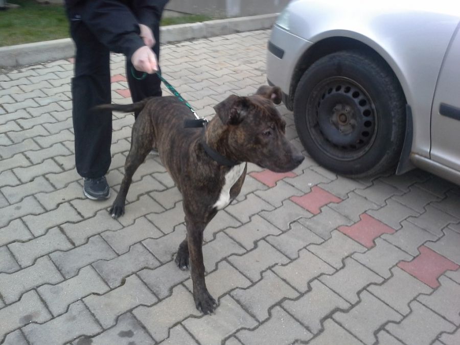 Pitbulteriér, hnědočerné barvy s bílou náprsenkou. Pes byl opatřen obojkem